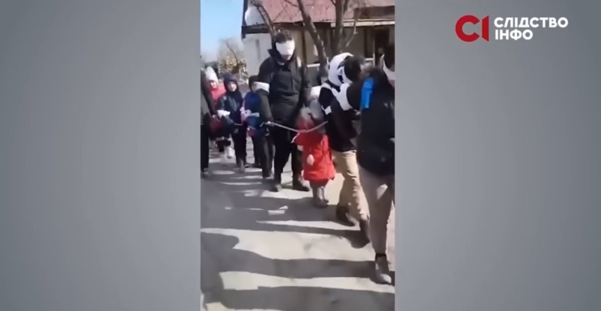 Russians are committing genocide against Ukrainians. In this shot, they are leading bound civilians, among them are children.