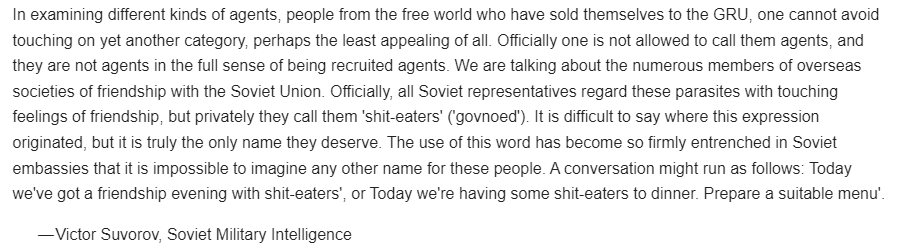 An interesting fact for pro-Russian voices on Twitter: Victor Suvorov in his "Soviet military intelligence" (1984) states that the term used by the GRU for unrecruited agents of influence who were conscious sympathisers of the Soviet Union was "shit-eaters" (Russian: говноед).