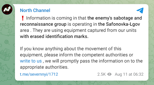 Kursk Oblast, Russian channels are spreading rumors that Ukrainian SOF units are operating in the Russian rear area, using captured Russian equipment to blend in and conduct attacks.
