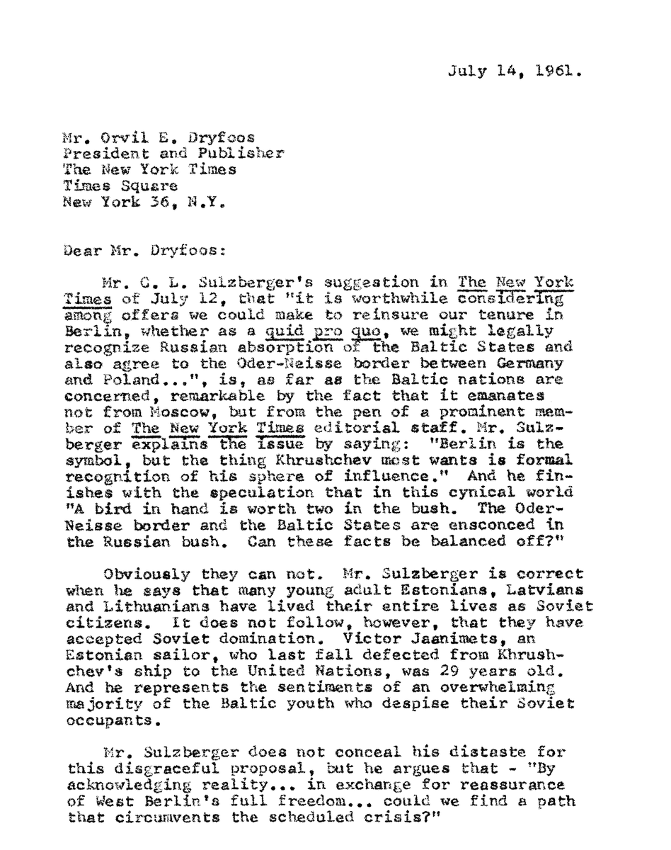n 1961 when Kennedy was considered weak and young by the Kremlin and the Russians pushed for taking over West Berlin. Appeasers of the time proposed the US should recognise the Soviet occupation of the Baltic states to get a Soviet "guarantees of West Berlin's freedom". Same idiocy as today with Ukraine. This is the Baltic response from 1961