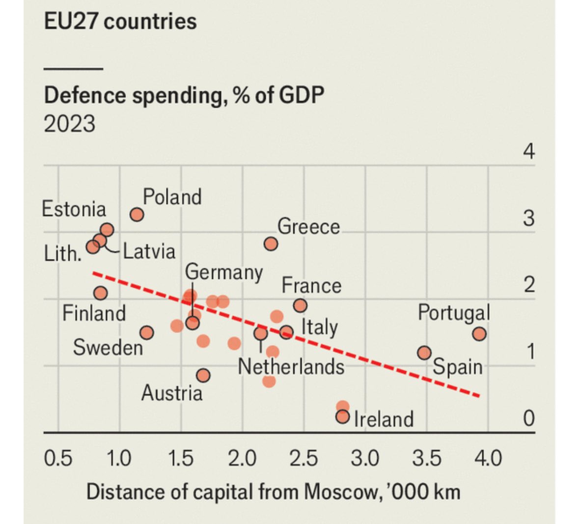 The association between defence spending and distance from Moscow among EU countries