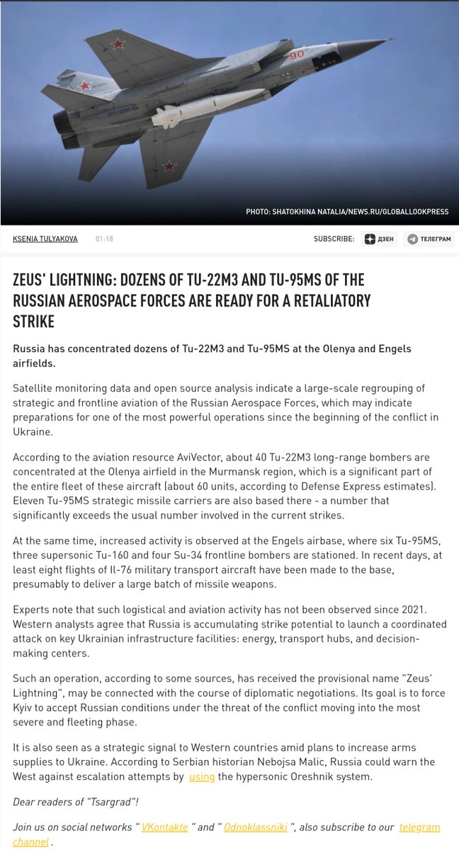 Ta informacija je bila 31. maja, dan pred ukrajinsko operacijo Pajkova mreža, objavljena na spletni strani Tsargrad, ki jo financira in nadzoruje Kremelj. Članek je bil nato izbrisan 1. junija, ko je Rusija izgubila tretjino svoje flote strateških bombnikov, ruska operacija za to noč pa je bila prekinjena.