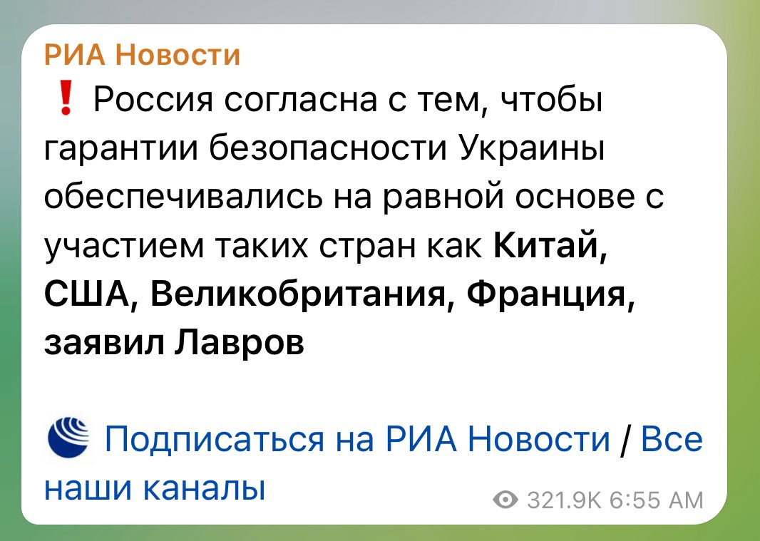 Varnostna zagotovila, ki sta jih Trump in njegov odposlanec Witkoff trdila, da jima je uspelo pridobiti od Rusije, niso takšna, kot se zdijo. Kot je danes pojasnil ruski minister za zunanje zadeve Lavrov, se stališče Kremlja od istanbulskega protokola iz leta 2022 ni spremenilo, kar pomeni, da bi Moskva pristala le na varnostna jamstva, ki bi ji zagotavljala pravico veta pri morebitnem odzivu: "Rusija se strinja, da je treba varnostna jamstva za Ukrajino zagotoviti na enakopravni podlagi ob sodelovanju držav, kot so Kitajska, ZDA, Velika Britanija in Francija."