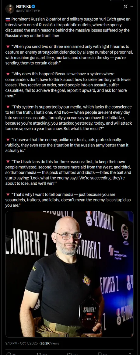Unilseptij: Vidiš jaz pa vseskozi mislim, da se to ne more končati drugače kot z državljansko vojno in razpadom ne samo pederacije, temveš tudi rašije. O tem že vseskozi pišem in mislim, da se bo zadeva začela okoli leta 2027. Vzhod (predvsem zaliv morskih kumar) je že dolgo na radarju Kitajske. Glede na sporazum, je defakto že njihov. Rusi z metanjem aziatov na fronto pridno pomagajo. Ostat če samo ????????? ???????.