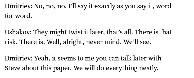 Bloomberg ima 2 posnetka telefonskih klicev. Na prvem s 14. oktobra Witkoff putinovemu svetovalcu Ušakovu svetuje, naj njegov šef pokliče Trumpa pred obiskom Zelenskega v Beli hiši in mu leze v rit, kar je tudi storil, na drugem z 29. oktobra pa Ušakov in Dmitriev razpravljata kaj storiti z mirovnim načrtom. Ideja je bila, da se ga v javnost spravi po "neuradnih kanalih", kar se je prav tako na koncu zgodilo.