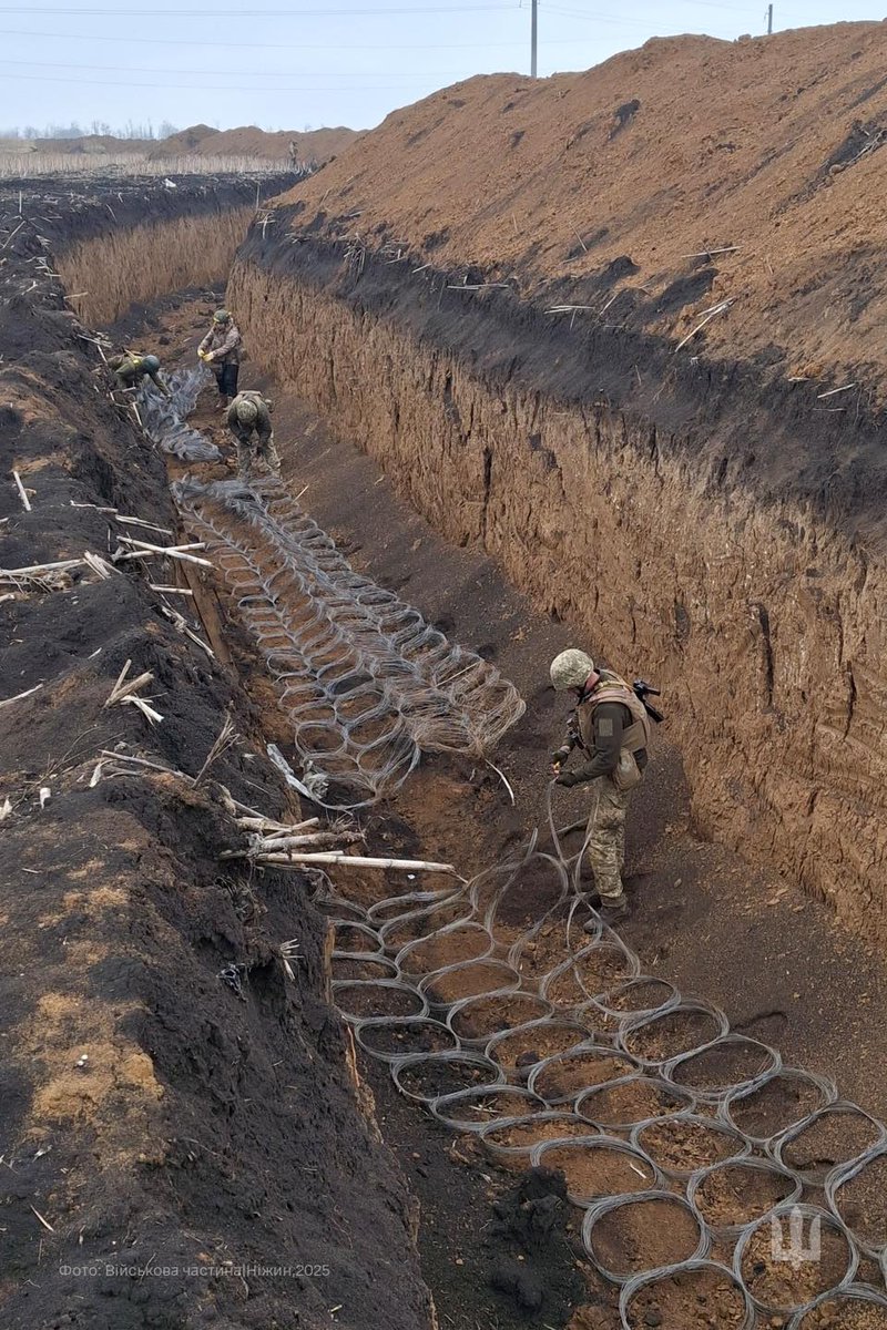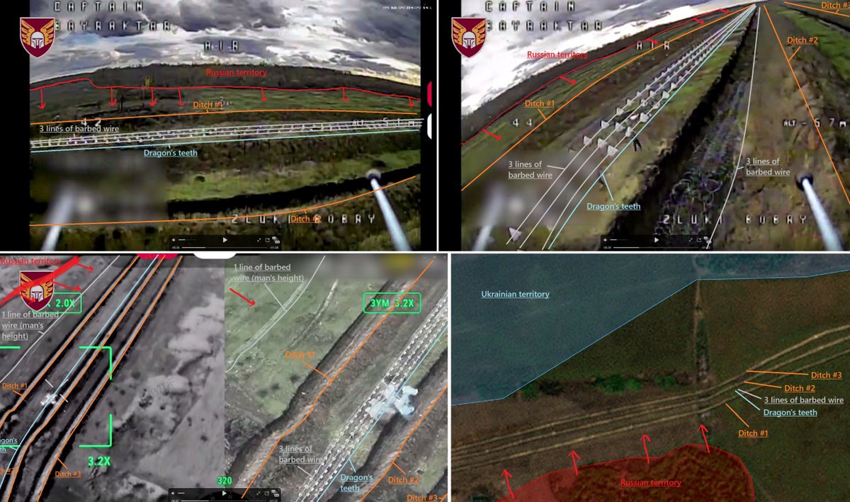 Leta 2025, ko večino izgub povzročajo droni, ni več smiselno, da se na fronti zbira preveč vojakov. Pomembni postanejo bodeča žica in jarki. Ukrajinska strategija temelji na neprekinjeni črti (prekinjeni z nekaj prehodi, nadzorovanimi z neposrednim ognjem ali droni), sestavljeni iz treh protitankovskih jarkov, napolnjenih z bodečo žico, zobečimi žičnimi ovirami in več vrstami bodeče žice. Cilj? Zmanjšati ali celo preprečiti frontalni prehod teh črt.