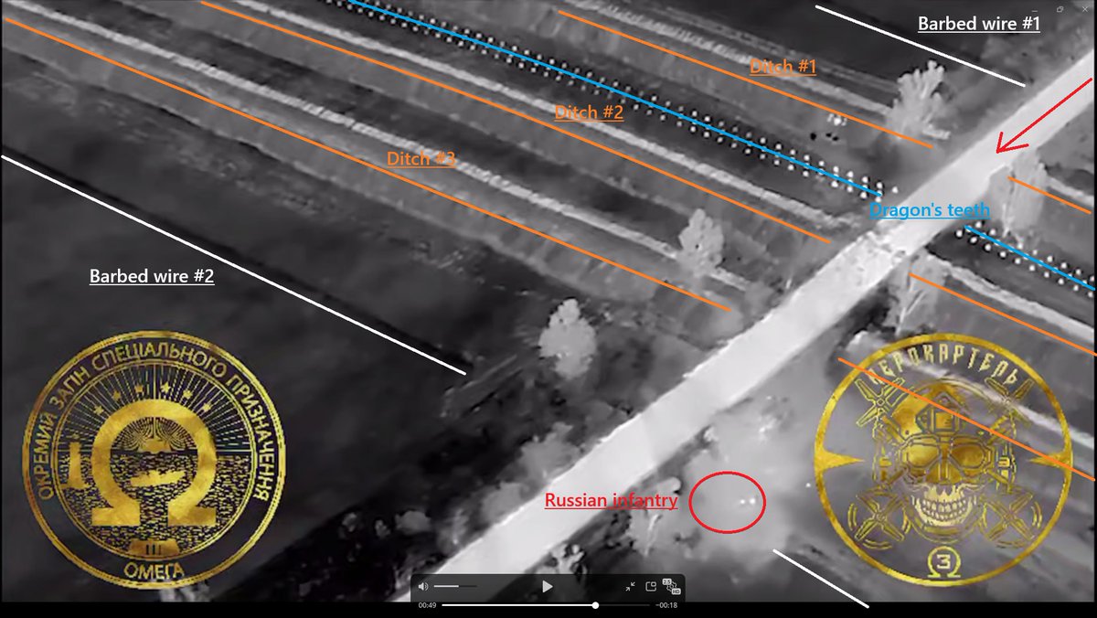 Bodeča žica in jarki preprečujejo prehod pehote ali pa ga upočasnjujejo. (posnetki @Playfra0) Ti drugi posnetki @Playfra0 prikazujejo ruske vojake, ujete sredi obrambne črte ali na edini cesti sredi.