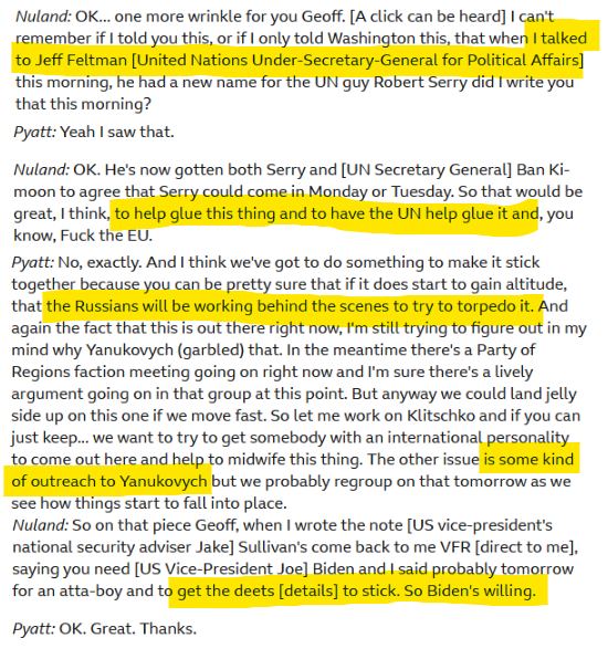 Namreč iz transkripta klica, ki so ga Rusi priročno leakali delno in tako, da ne moreš vedeti kdaj izvira (verjetno pa 25. Januar 2024) je razvidno, da je Nulandova hotela da ostane Janukovič na oblasti (še 1 leto do volitev). Ukrajinska opozicija se s tem ni strinjala in so Janukoviča vrgli..