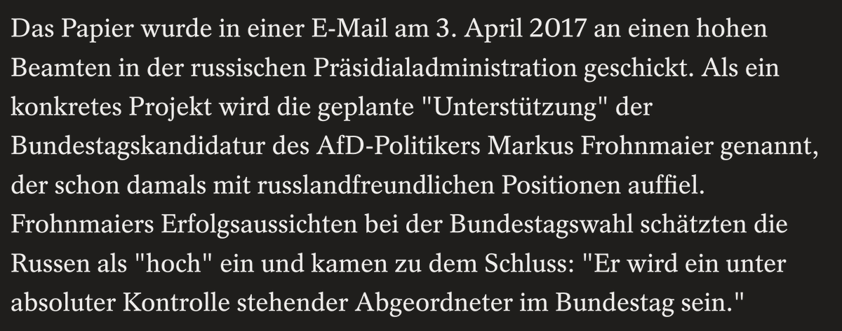 Opomba: Markus Frohnmaier, poslanec AfD, ki prihaja v ZDA, da bi govoril na slovesnosti New York Young Republican Club, je bil v ruskem strateškem dokumentu, poslanem visokemu uradniku v Putinovi predsedniški administraciji leta 2017, omenjen kot „nemški poslanec pod našim absolutnim nadzorom“.