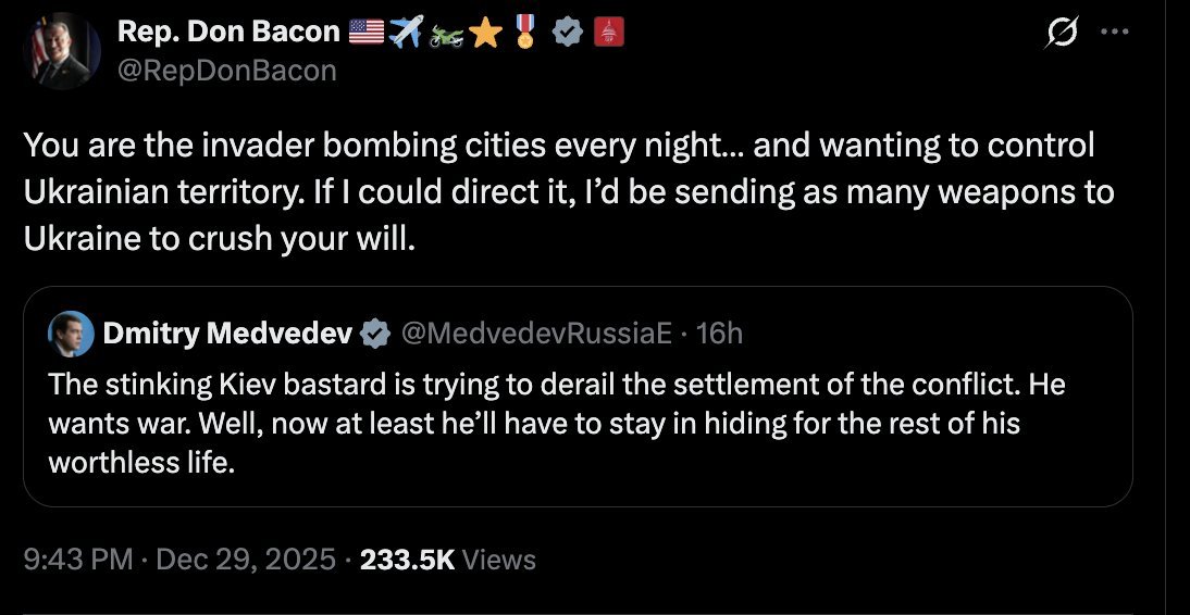 US-Congressman Don Bacon absolutely torches Medvedev. This is exactly how you communicate with the Russian regime.