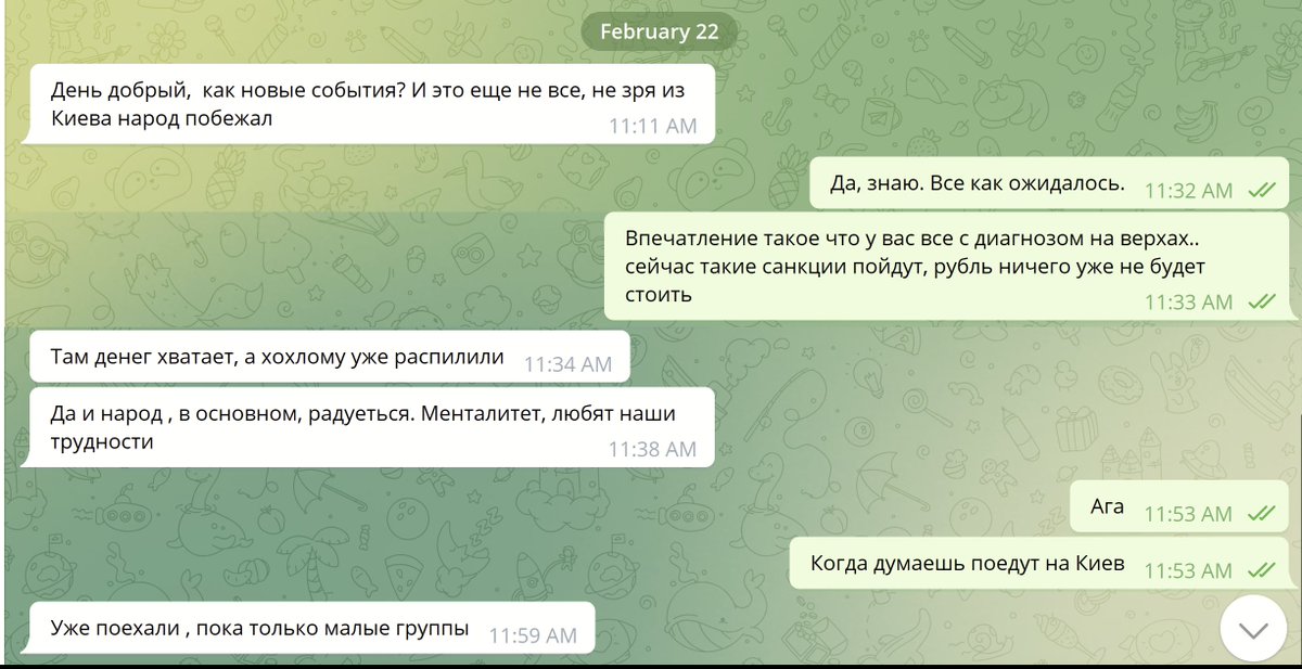 One of the Wagner mercenaries. 24 February. They *really* were sure. He doubled down: "Ukraine's armed forces are suffering huge losses. RU special ops are near Kyiv. By the end of the week the Ukrainian armed forces will no longer exist as a structure." To my question if killing Zelensky was one of Wagner's advance team targets: "Well yeah, it's war after all..." 26 Feb. I point to Ukrainian news of shot RU plane: