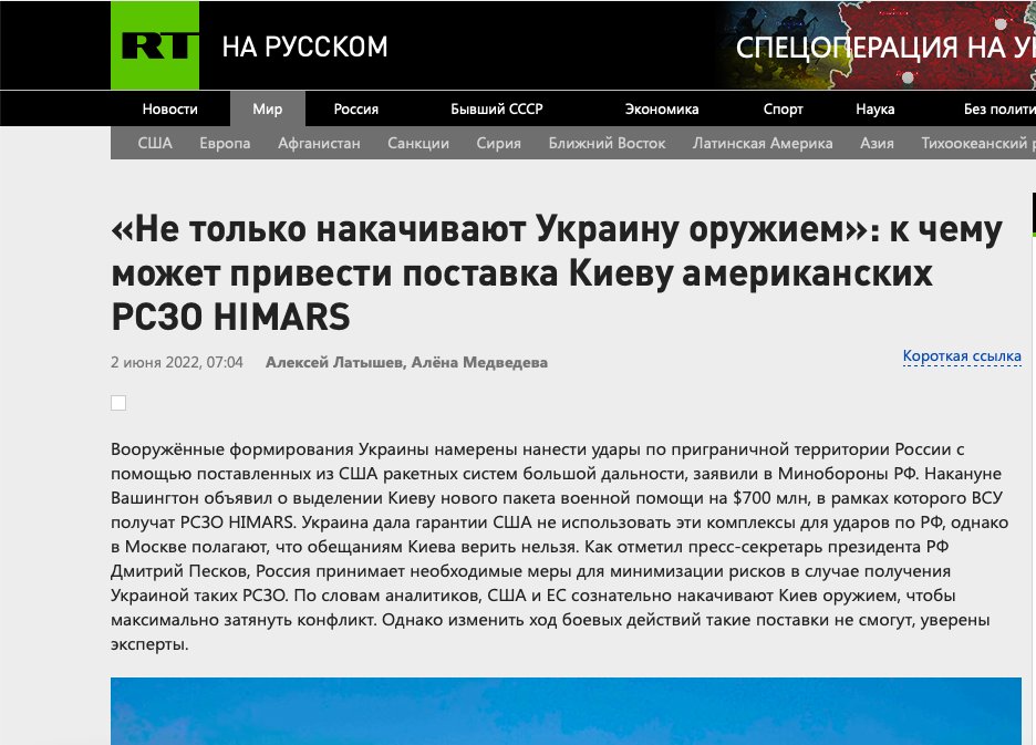 RT writes that "the US and the EU are deliberately pumping weapons into Kyiv to prolong the conflict as much as possible." Still, at the same time, "such deliveries will not be able to change the course of hostilities," the article reads. Politnavigator, a Russian news website, published an article titled "US hands over weapons to Ukraine that can kill thousands instantly." "Zelensky can strike at the centre of Belgorod or Donetsk and kill thousands of people at once," the article reads. Ukraina.ru, a Russian state-owned propagandist website, writes that HIMARS is a weapon that can hit Russia, causing it harm and damage, for which the United States keeps the Kyiv regime on the payroll." Ukraine's Armed Forces are ready to show all the invaders where hell is, they just need more heavy weapons #StopRussia #ArmUkraineNOW