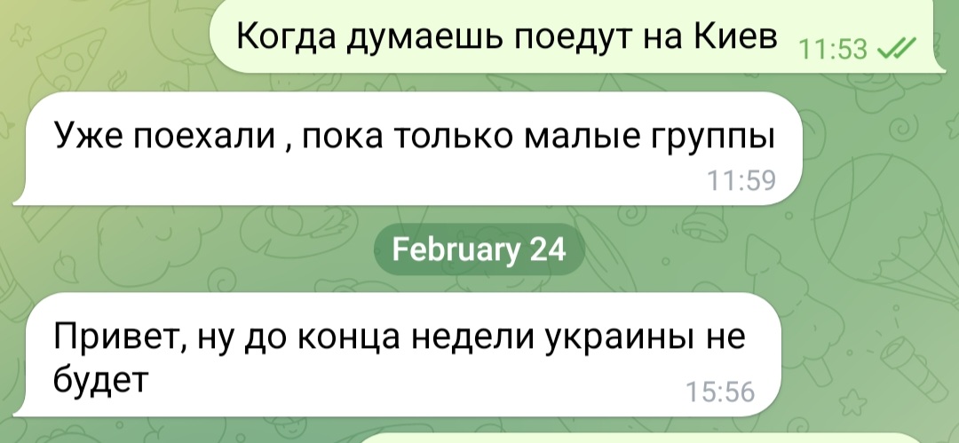One of the Wagner mercenaries. 24 February. They *really* were sure. He doubled down: "Ukraine's armed forces are suffering huge losses. RU special ops are near Kyiv. By the end of the week the Ukrainian armed forces will no longer exist as a structure." To my question if killing Zelensky was one of Wagner's advance team targets: "Well yeah, it's war after all..." 26 Feb. I point to Ukrainian news of shot RU plane: