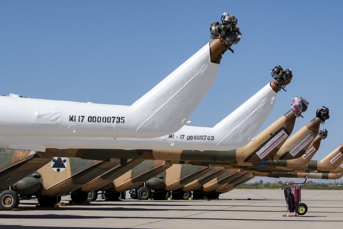 11 Mi-17 helicopters from US Air Force 309th Aerospace Maintenance and Regeneration Group are placed on the flight line in preparation for transport at Davis-Monthan Air Force Base, Arizona, April 22. They are delivered to Ukraine.