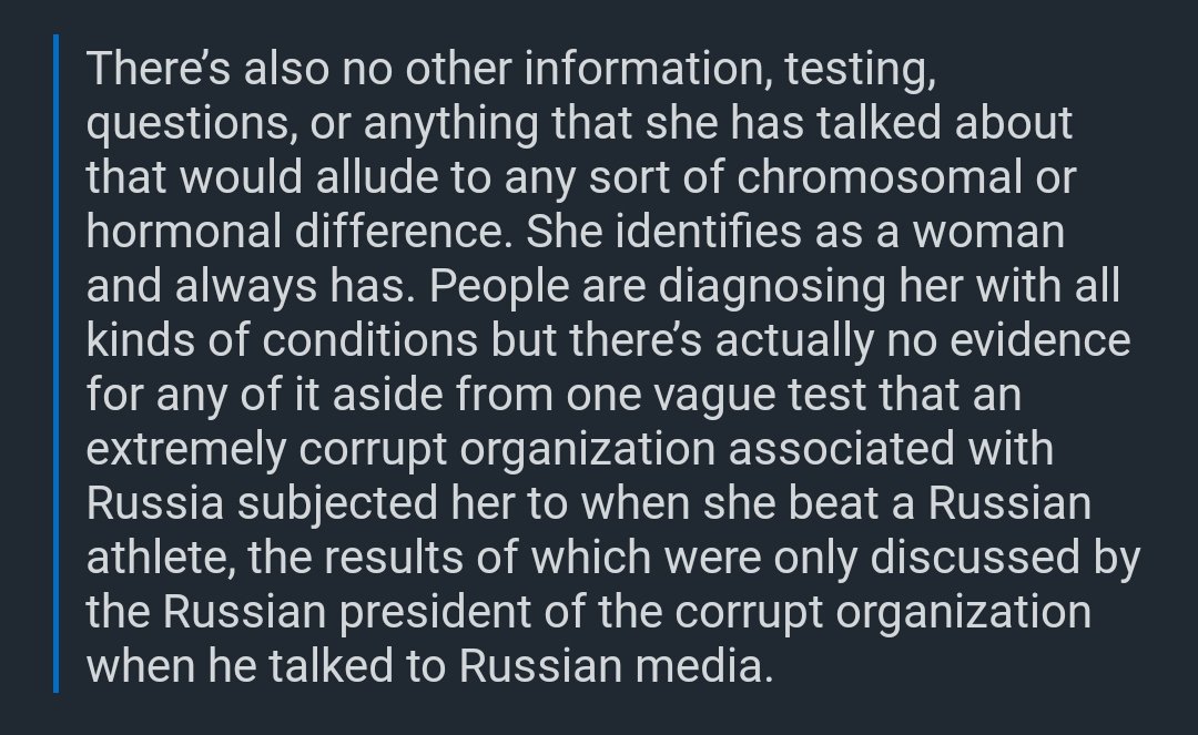 Plus, prvič, to je tvoj desnjakarski imaginarij, nimaš nobenih dokazov za svojo zgodbico, kolikor sem pa našel na spletu, to, da ima xy kromosome je izjavil predsednik IBA Umar Kremlev, češ, da so naredili DNK teste, ampak niso predložili nobenih dokazov niti ni praksa, da bi take teste delali, merijo zgolj testosteron, tako da tudi v to nisem ravno prepričan..