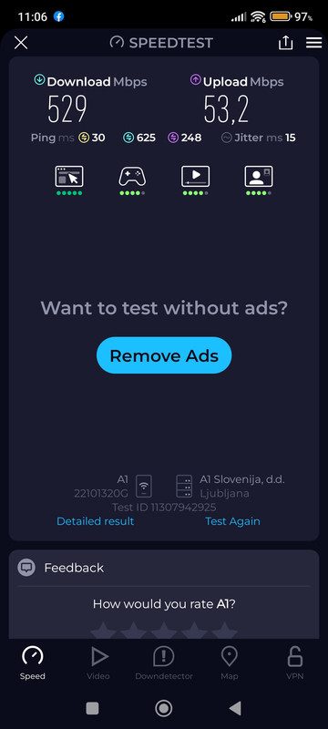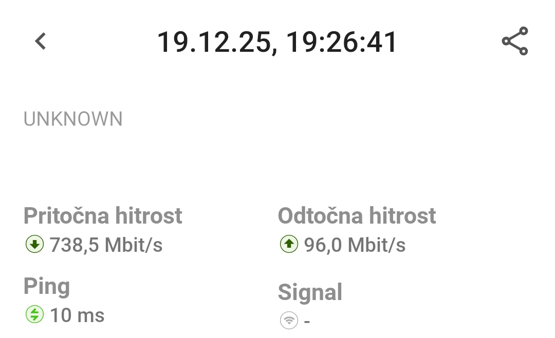 Pri meni je download se ok 100-300Mbps. Upload je pa nizek med 5-10Mbps. Res oddajnik ni blizu. Oziroma po njihovi online mapi, mi niti ne bi smelo delovat...