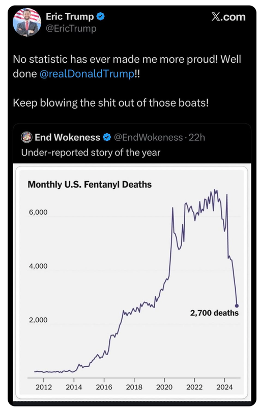 Tole me spominja na primer pred tedni, ko so se trumptardi na twitterju začeli slinit nad grafom, ki prikazuje, kako so smrti od fentanila rekordno padle.. Hvala Donald Trump... Pozabili so pa pogledat na grafu, da se X os izteče pred letom 2025, se pravi še preden so MAGA fašisti sploh prešli na oblast, LMAO.