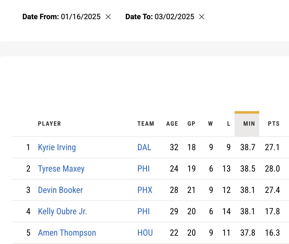 Od 16 januarja letos do 3 marca je Kyrie igral največ minut. In bil tudi najstarejši in z najdaljšim popisom prejšnjih poškodb.