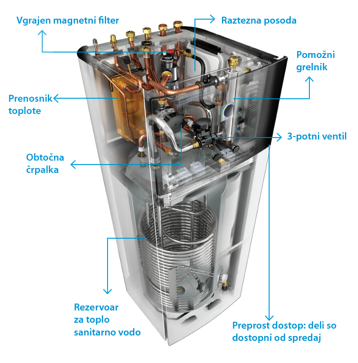 Joez7 in Alekskac, dobra navodila, se strinjam... Ene raztezne posode za ogrevalni sistem so znotraj 'hišne enote' ob strani in so mat-sive barve, če čez leta pritisk pade, pokrov normalno snameš, natlačiš na ventilčku na sredini raztezne posode - in glej sistemski manometer, do kod žiher natlačiš, več kot en bar je že vprašanje - je pa tako že potem rdeče polje. Dobro je tudi pogledati opis TČ - komponentni diagram ali priročnik za montažo. Lahko sicer pokaže serviser ali pokličeš monterja, navadno vse povejo tudi preko telefona, še vodi te, ko delaš prvič; že tako dovolj zaslužijo, ni jim potrebno vsakega EUR vleči sproti :D