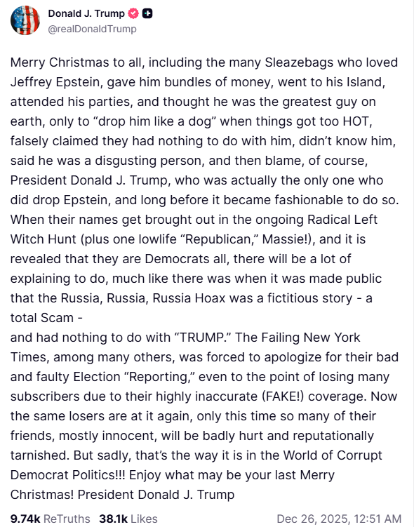 Bo kdo komentiral Epstein farso? Saj ne, da je bila 100% predvidljiva, pa vendar. Kršijo zakon, ki so ga sami podpisali, objavili so mogoče 5% dosjejev in še to skrbno prečiščenih. Trumpa nikjer. Okostnjaki bodo čez par let padali iz vseh omar.![]()