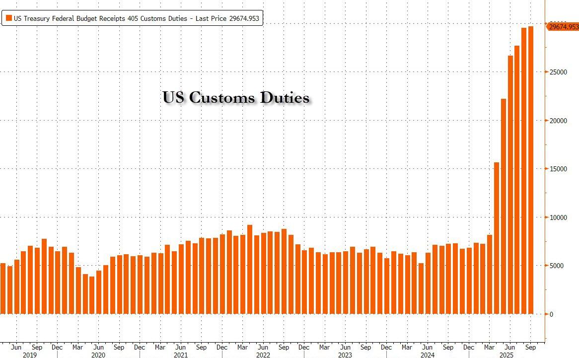 A big reason for the stellar September surplus is that tariff collections continued apace, and in September the US government collected a record $29.7 billion in tariffs, which translated in a record $195 billion for the fiscal year. And since Trump's tariff regime was only active for 6 of the past 12 month, expect tariffs to deliver about $350 billion in annual revenue every year, unless they are canceled.