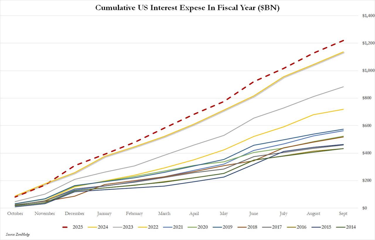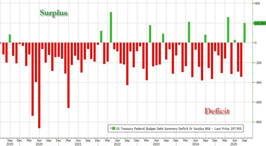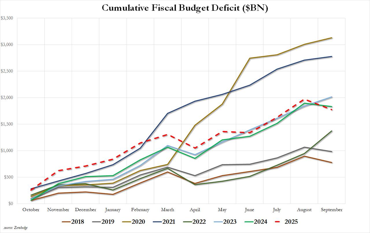 Those looking for data on the US budget deficit contained in the Monthly Treasury Statement had to wait a few weeks because of the government shutdown, but better late than never, and today at 2pm, the Treasury unveiled the US income statement for the just concluded fiscal year 2025. It was ugly, but not as ugly as it could have been and the month of September was outright impressive.