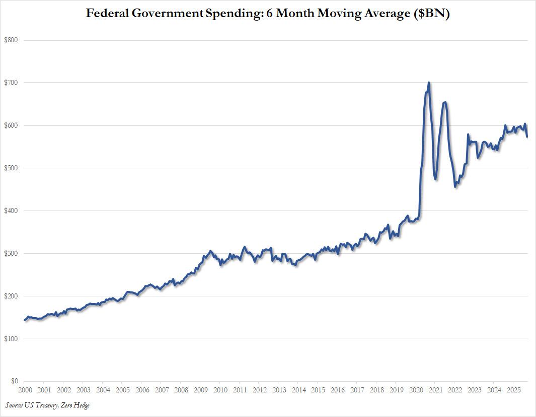 On the outlays side, here too there were notable improvements, with the US government spending only $346 billion, a sharp from from the $689 billion in August, and down a whopping 25% from the $463 billion last September. Even more remarkable is that the six month moving average of govt spending suddenly slumped from $604 billion - the highest since covid - to $573 billion, the lowest since June 2024. Yes, the improvement may be small, but every little bit helps and whatever Trump is doing to shrink govt spending is starting to show.