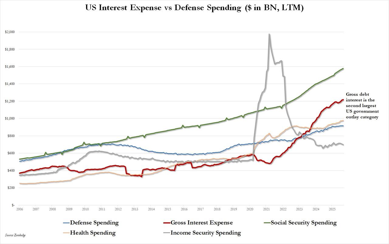 ... means that the US interest expense continues to be the most dangerous, and rapidly rising, spending category of all: to wit, at $1.22 trillion in the past 12 months, gross interest expense is less than $400 billion away from catching up to Social Security Spending.