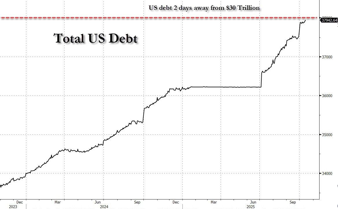 That's the good news. The bad news is that the impressive September numbers were largely a calendar effect with much of the outlays delayed until next month, which means October's numbers will be that much uglier. And worse, the exponential increase in total US debt which will surpass $38 trillion in 2 days and $40 trillion in under a year...
