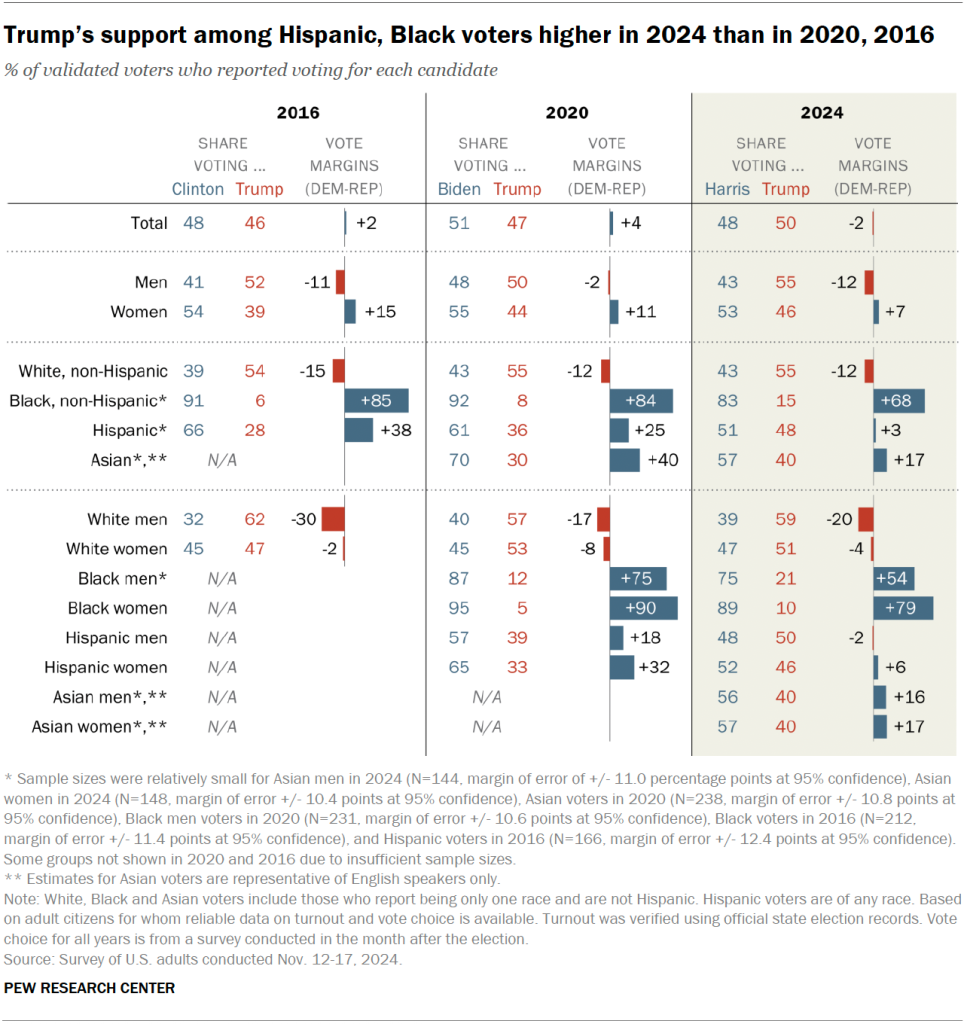 Je treba bit malo bolj natančen... pridobil je med črnkami in latinkami... med belkami je izgubil (2020 napram 2024)... vir... pewresearch.org