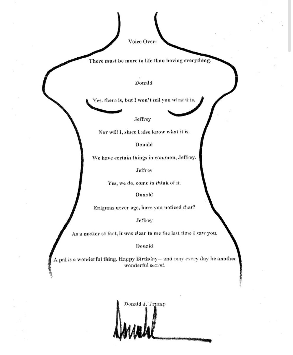 Trumpovo pismo Epsteinu za 50. rojstni dan, okrog katerega je tožil WSJ češ da ne obstaja, še ni prišlo do sem?
