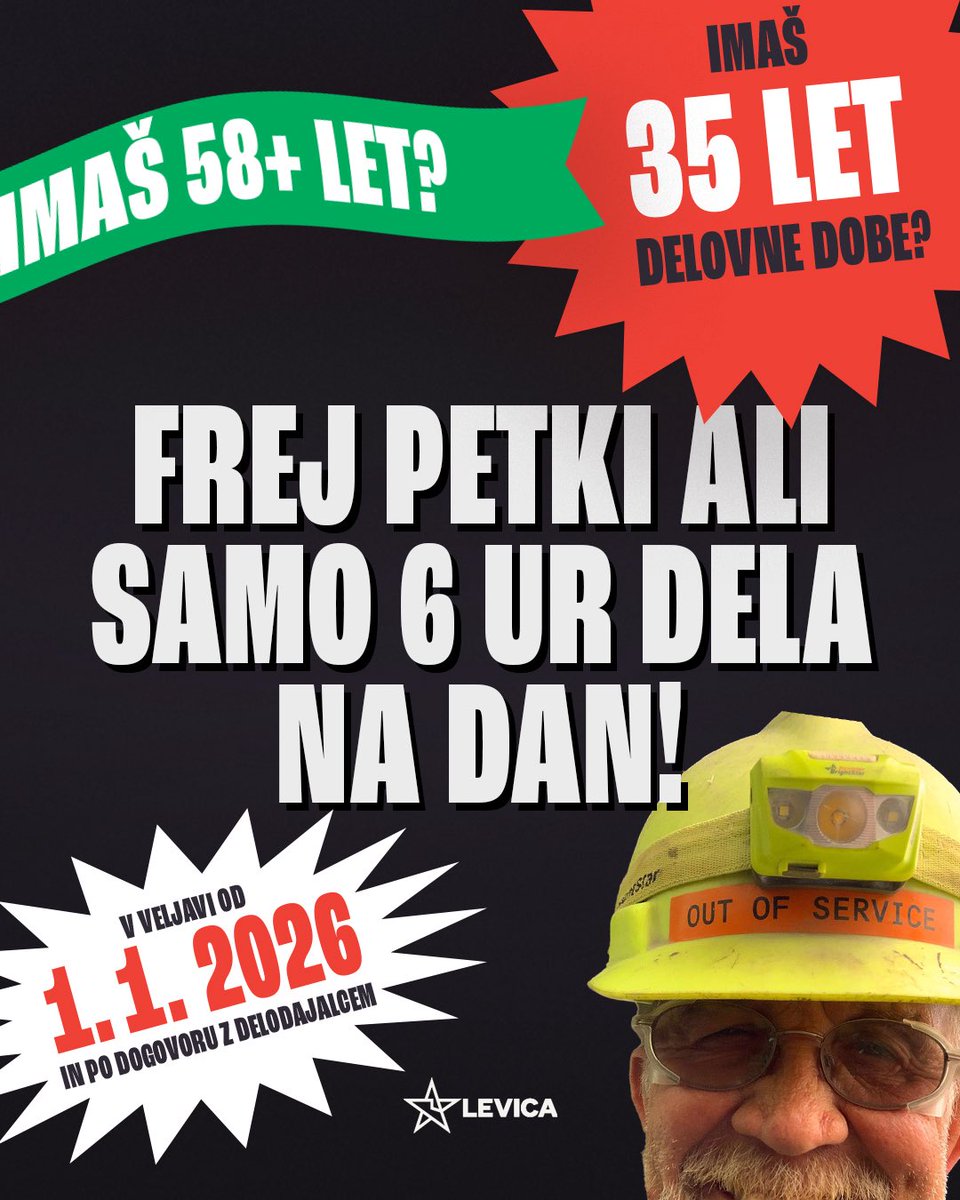 Sem na hitro prebral in sem mislil, da piše šest ur dela na dan in še fraj petek. Če slogan popravijo, so me kupili takoj. Mi je pa všeč čas pred volitvami, ko se stranke borijo za naklonjenost. Po volitvah pa pride streznitev. Delo do skoraj 80 let in po možnosti še dva šihta, da lahko odplačuješ kredit, ki si ga najel pred desetletji, da imaš sploh kje za živet na stara leta.
