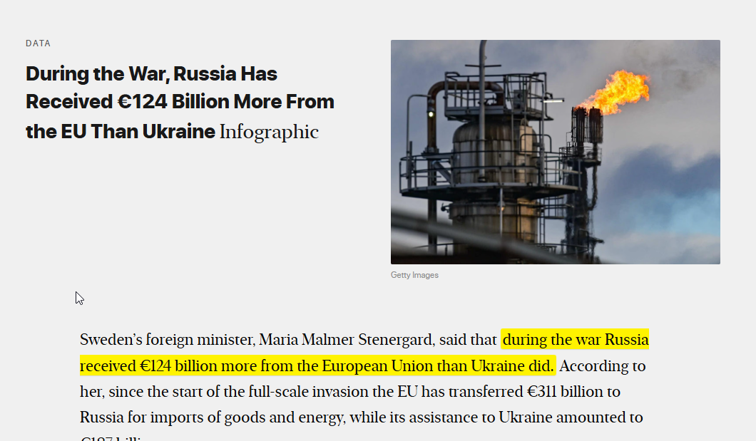Evropa je populistični brezzobi Blefer, ki se je zapela v Ukrajinsko zgodbo, ko je mislila da ima moč, istočasno pa ničesar, kar bi to moč lahko izražala. In DANES je EDINA in ŠE VEDNO Edina zgodba da bo Rusija propadla, kot cilj, ki se kot kaže lomi na EU proračunih… Zagotovo pa vemo da smo se v EU na račun Rusophrenikov odpovedali in se še bomo odpovedovali svobode, katere smo bili vajeni pred letom 2022. Morda je pa to cilj trenutne Evropske elite.