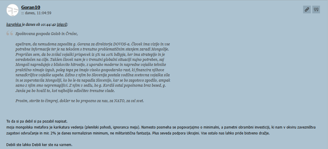 apeliram, da nemudoma zaposlita g. Gorana za direktorja DOVOS-a. Človek ima vizijo in vse potrebne informacije ter je na tekočem s trenutno problematičnim stanjem zaradi Mongolije. Prepričan sem, da bo zvišal vojaški prispevek iz 5% na 10% bdbpja, ker ima strategijo in je osredotočen na cilje. Takšen človek nam je v trenutni globalni situaciji nujno potreben, saj Mongoli napredujejo z bliskovito hitrostjo, z uporabo moderne in napredne vojaške tehnike praktično nimajo izgub, poleg tega pa imajo visoko gospodarsko rast, ki financira njihove nenadkriljive vojaške uspehe. Edino z njim bo Slovenija postala vodilna svetovna vojaška sila in se zoperstavila Mongoliji, ko bo le-ta napadla Slovenijo, kar se bo zagotovo zgodilo, ampak samo z njim smo nepremagljivi. Z njim v sedlu, bo g. Kordiš ostal popolnoma brez besed, g. Janša pa bo hvalil to, kot najboljšo odločitev trenutne vlade.
