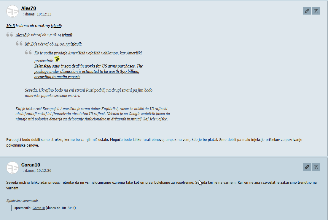 Da sej pravimo , Rusphrenija je na pravem mestu, drugače bi se začel ukvarjati z realnimi problemi v Evropi, kot na primer, poveličevanje absolutne demokracije, Rast strank kot so AfD in podobno, ampak vem je razje razlagati da je vojna Ukrajini s strani NATA no EU-ja zgubljena, in to TACO ve...samo zakaj bi pa bezal v problem, ko se je EU odpovedala lastni suverenosti, kot kaže še marsičesa.