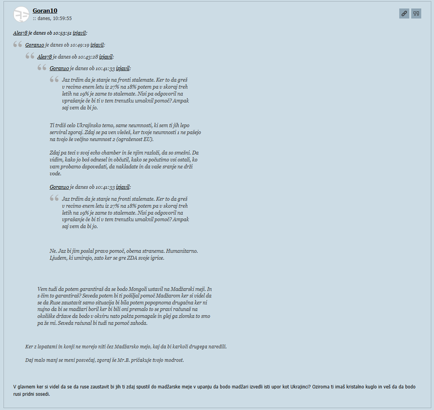 Prav tako DO DANES, nisi bil sposoben PODATI V ŠTEVILKAH, iz katerih virov si pridobil informacije, da bo Rusija prišla do madžarske meje teh 1600km, ko ni sposobna niti 10 km na leto. Vem težko je sesti za mizo in se začeti resno pogajati o miru.