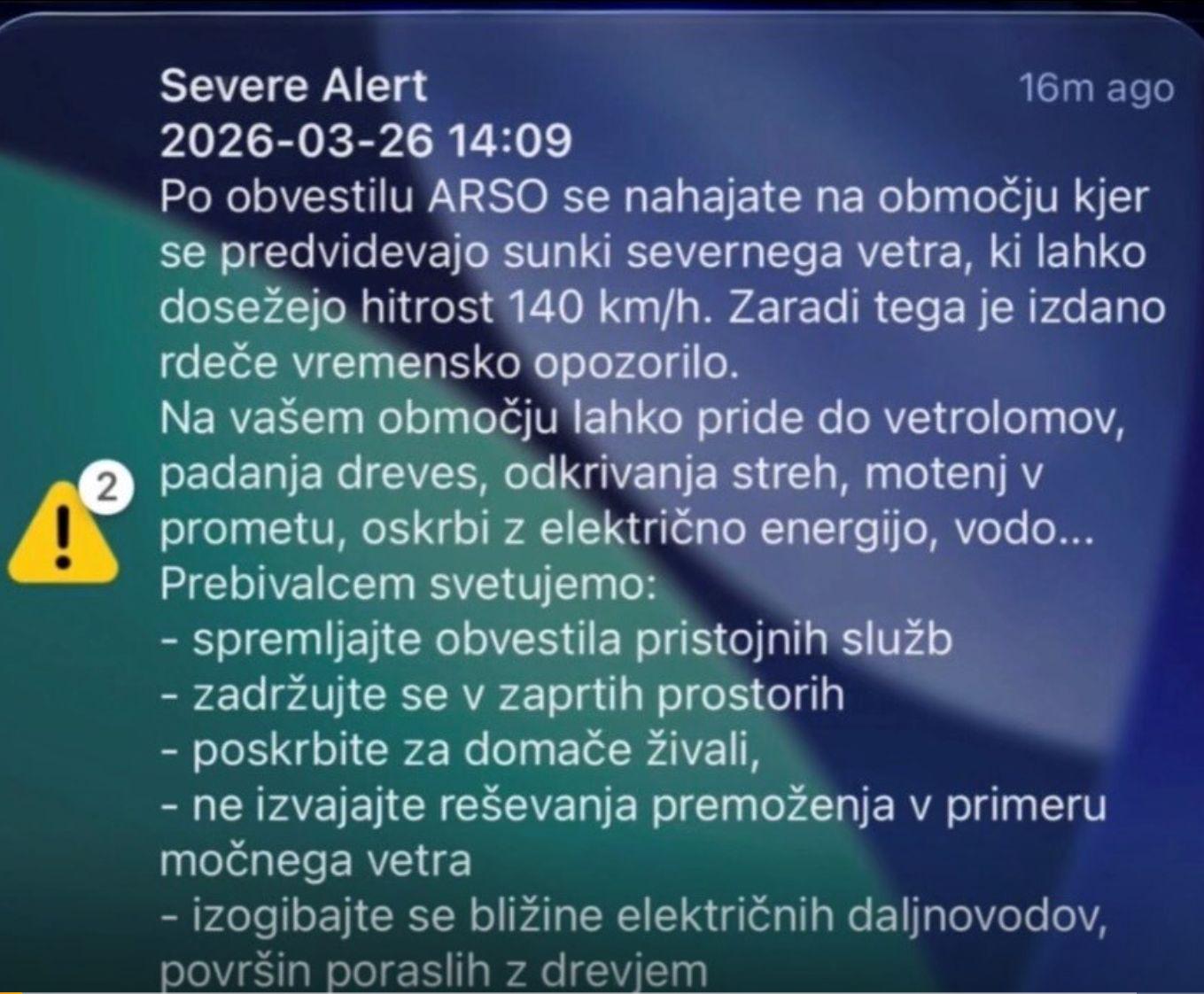 Glej: Močen veter bo pihal naslednjih 36 ur, prebivalci severa države dobili opozorila na telefone