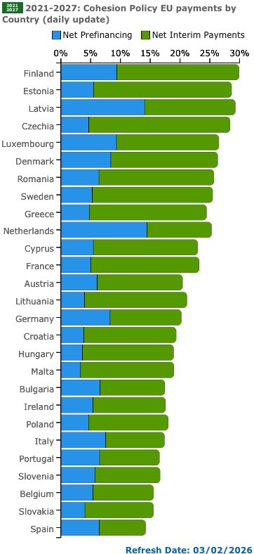 če je bila država še v prvi polovici lanskega leta na zadnjem mestu po projektih v izvajanju, smo po tem kriteriju po zadnjih podatkih Evropske komisije napredovali za 11 mest. S tem se trenutno uvrščamo tik nad povprečje držav članic EU, za Finsko in pred Francijo. Za sedem mest pa smo napredovali tudi pri plačilih iz bruseljske blagajne v proračun Republike Slovenije,