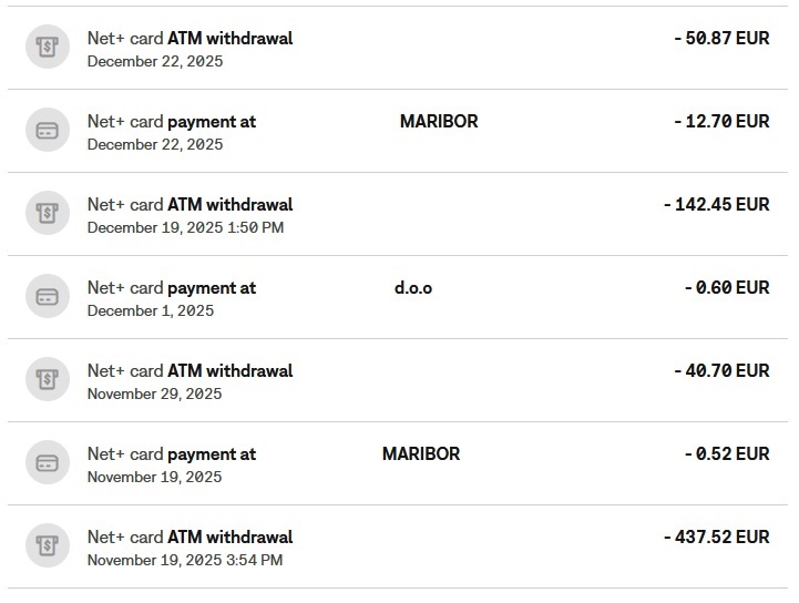 Dvigi na bankomatu (všeta provizija 1,75%) in plačila (ni provizije):