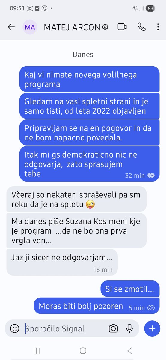 Načeloma svojih komunikacij ne objavljam. A tale današnja s podpredsednikom vlade in Gibanja Svoboda je zabavna. Nimajo programa za volitve, boji se, da bom to dejstvo prva vrgla ven. In mi po pomoti še sporoča, da mi ne odgovarja