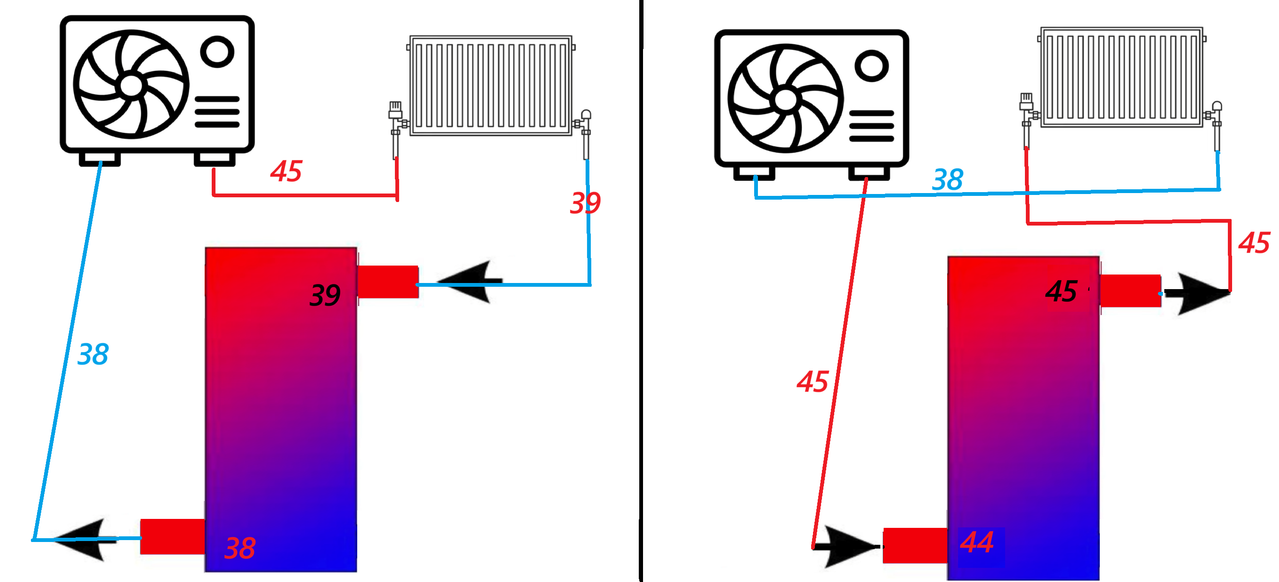 A lahko tukaj pričakujem, da bo vhod in izhod iz zalogovnika približno enak? V tem primeru vstop 45, izhod proti radiatorjem zgoraj pa 44-45 ?