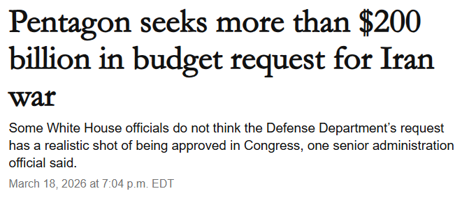 The Pentagon has asked the White House to approve a more than $200 billion request to Congress to fund the war in Iran, according to a senior administration official, in an enormous new ask that is almost certain to run into resistance from lawmakers opposed to the conflict.