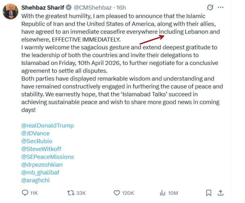 Da ne boš spet skakal kot mačka okorg vrečle kaše in trdil, da no bilo v dogovoru premirje tudi za Libanon, to je izjava Pakistana: