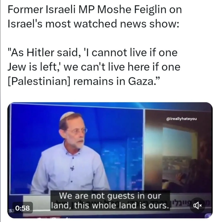 Vi, po drugi strani, ki svet dojemate čez prizmo zahodnega moraliziranja in me neprestano obtožujete hinavščine, pa ploskate Izraelu pri etničnem čiščenju ter gradnji Velikega Izraela. Saj bi vas obtožil hinavščine, pa se mi res ne da brati na stotine strani blejanja o posiljevanju ter obtožbi žrtve, da nosi mini krila, ter podobnih oslarij.