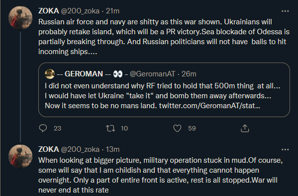 Čisto tako - spomnim se, da so bili v prejšnjih tednih komentarji, kako Rusi bombardirajo butaste Ukrajince na Kačjem otoku. Samo ne vem ali tule, na MMC ali v tvitih.