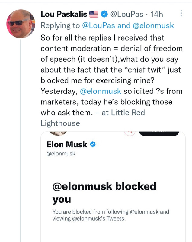 Levičarji, ki so se norčevali iz Muska, že jokajo, da jim je Musk omejil račune v boju za svobodo govora. Enostavno ne razumejo, da moraš za pravo svobodo govora včasih tudi moderirati vsebine, da ne prevladajo moteči elementi.