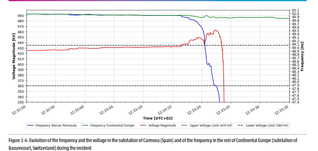 Med 12.32:00 in 12.32:57 je v Španiji izpadlo 208 MW proizvodnje sonca in vetra, hkrati pa je poraba narasla za 317 MW, za kar ne poznajo natančnih razlogov. V naslednjih dvajsetih sekundah so zaradi prekinitve povezav izgubili še 2 GW proizvodnje.