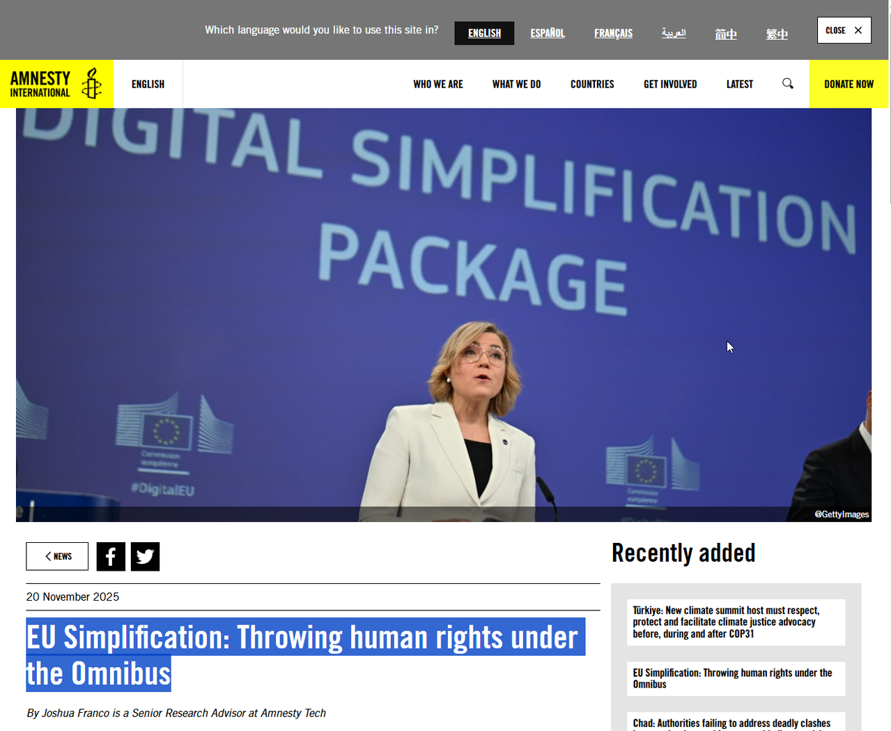 U regulations also affect how large digital platforms impact our rights, and if the Digital Services Act and Digital Markets Act are brought into scope (such as through the so-called “Digital Fitness Check”) as expected, this could be a significant roll back as well. The risks from the profit-driven, surveillance-based, algorithmic curation of our online content cannot be overstated. Amnesty International research has demonstrated how this technology has contributed to ethnic cleansing against Rohingya Muslims in Myanmar, and grave human rights abuses against Tigrayan people in Ethiopia with Meta failing to moderate and, in some instances, actively amplifying harmful, discriminatory content on Facebook.