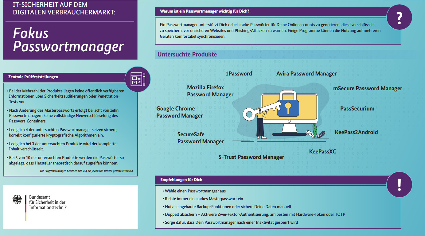 Slo-Tech - Nemški Zvezni urad za informacijsko varnost (BSI) je preveril najpopularnejše upravljalnike gesel (password manager) in pripravil priporočila tako za končne uporabnike kot tudi za avtorjev teh orodij. Preverjali so, kako zavarovan je dostop do gesel v upravljalniku, ali ima proizvajalec možnost gesla videti (ne sme jih!), kakšno zaščito nudijo uporabnikom, katere dodatne funkcije vključujejo in ali je kodo možno neodvisno preveriti. Preverili so deset upravljalnikov, ki so na voljo za Windows, macOS, Android oizroma iOS. Sprva so identificirali 24 upravljalnikov gesel, nato pa so preizkusili 10 finalistov.