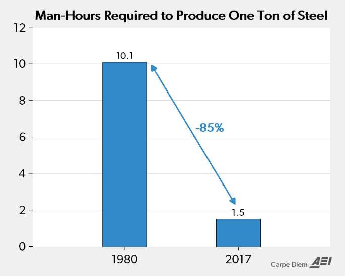 Someone should tell Trump about Voestalpine AG’s steel plant in Austria, which reveals the reality of steel production and jobs. A Bloomberg News story from June 20, 2017 offered a fascinating look at how a modern plant can now produce high-quality steel with few workers. The plant in Donawitz, a two-hour drive from Vienna, needs all of 14 employees to make 500,000 tons of steel wire a year. The same mill in the 1960s would have needed as many as 1,000 workers to produce a similar amount albeit of lesser quality.